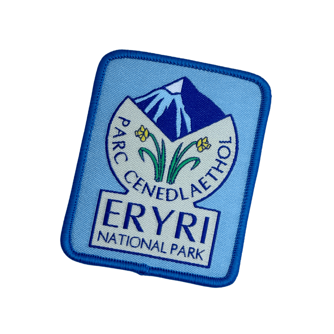 Logo'r parc cenedlaethol ar ffabrig bathodyn i'w wnïo i'w le.