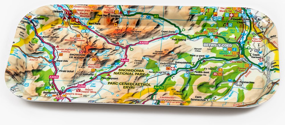 Hambwrdd gyda map Arolwg Ordnans o ardal Yr Wyddfa.